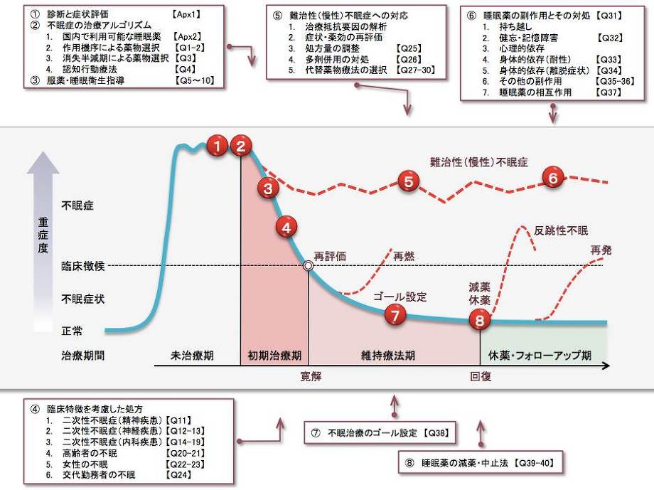 内容及び補足(含質疑応答)「不眠の症状としては、①入眠困難、②睡眠維持困難(中途覚醒)、③早朝覚醒、④睡眠の質の悪さ(熟睡感の欠如)があるが、それ以外の症状として、①疲労感、不快感、②注意力、集中力、記憶力の低下、③日中の眠気、④社会的、職業的機能低下、または学業低下、⑤気分の障害またはイライラ感、⑥動機づけ(モチベーション)、活動性、積極性の減弱、⑦仕事のミスや運転中の事故のおこしやすさ、⑧睡眠不足による緊張、頭痛、胃消化器症状、⑨睡眠についての心配、悩み、が挙げられる。