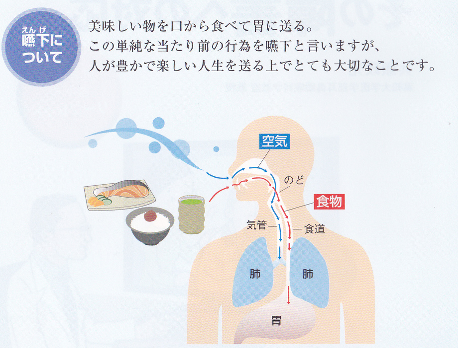内容及び補足(含質疑応答)「ものを食べた際に食べ物が胃に送り込まれる動きを嚥下といいます。この際、食べ物の動きと呼吸による空気の移動がのどの奥で交差します。