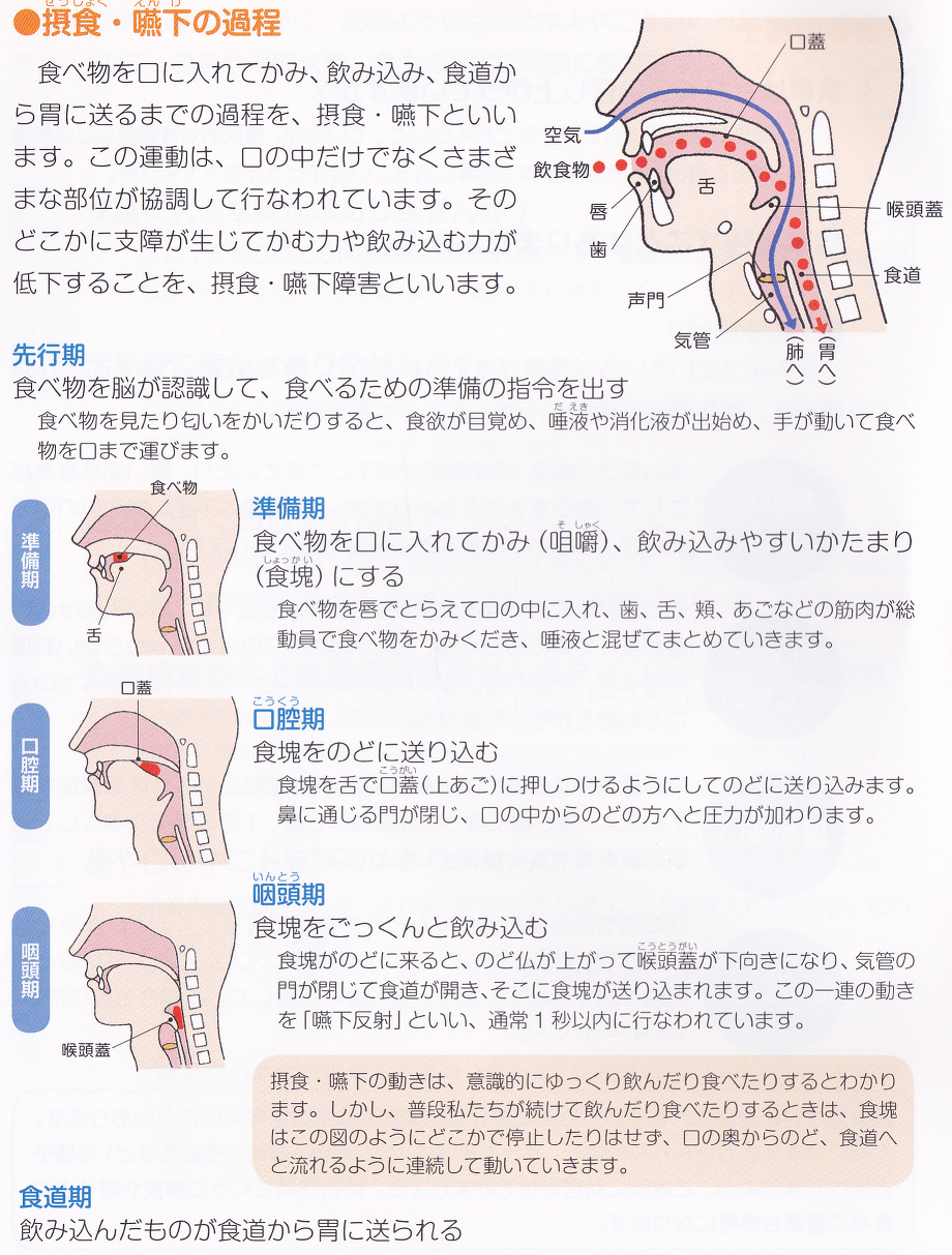 ④ 咽頭期において喉頭の前上方への拳上の際喉頭蓋の反転と喉頭の移動が起こりますが、この際喉頭蓋の反転で完全に気道がふさがらないことで、期間内に飲食物が流れ込むことが起きます。特に、食べ物や飲み物の一部が咽頭に残っている時に、喋るために、急激に息を吸い込むと、むせることになります。従って食事介護者が食べ物を飲み込んでもらった直ぐ後に声掛けをして返事をもらう際に、ムセが起きやすくなり、ひいては誤嚥性肺炎を誘発することにもなりかねません。喋ってもらう前に、つばを飲み込むような動作をしてもらうことが、誤嚥やムセの予防になります。