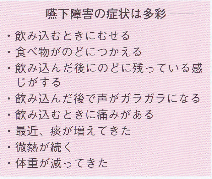 嚥下の症状は多彩であり、その具体例としては以下のものがあります。