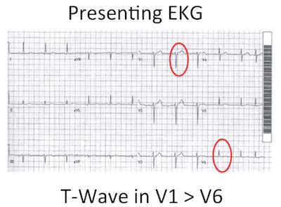右室梗塞は右室の拡張不全による右室流入障害があるため静脈圧が上昇し、頸静脈怒張、四肢冷感、血圧低下などが出現します。特に虚血性心疾患に良く使われる亜硝酸剤が禁忌なので注意が必要である。心電図でV1、V3R~V6RにおいてのST上昇で診断される。ことにV4Rの1mm以上のST上昇は重要である。Ⅲ誘導のST上昇が一番強い場合には、右胸部誘導を取る必要がある。