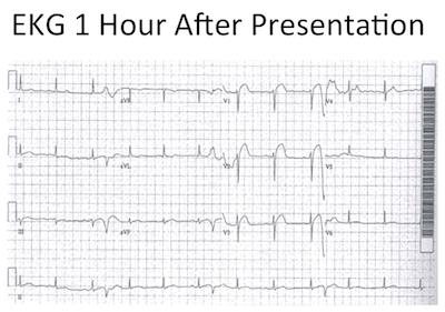 があると、ST部分の変を見つけることができるかもしれない。それも現実的には困難なのではあるが、一時間後の心電図をとることが出来さえすれば、本症例が、前壁の心筋梗塞であることは容易に診断できるはずである。