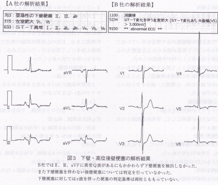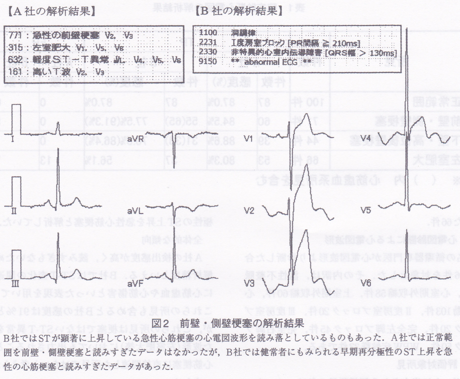 ここで問題となる点として、心電計の自動判定がある。実際、Hyperacute T波と思われるものに対して、T波増高、負荷可との判定があった。そこで12誘導の日本で代表的な二社の解析制度を比較したデータを見てみよう。