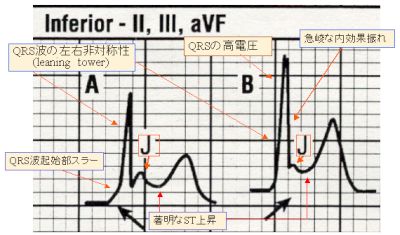 Boineauが下方早期再分極の代表的心電図所見として例示した第2 ,3, aVF誘導の心電図波形:QRS波起始部のスラー、緩徐なQRS波上行脚j、急峻な内効果様振れ、QRS波形の非対称性(斜塔、leaning tower), J波、上方凹のST上昇、陽性T波などの諸所見が認められる。