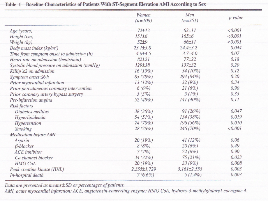 また、横浜市立大学付属市民総合医療センターを受診されたSTEMI457例(女性106:男性351)の検討では(女性の数:男性の数、有意差がある確率)、年齢(72:62、P<0.001)、高血圧の割合(70%:56%、P=0.019)、糖尿病の割合(36%:26%、P=0.047)、脂質異常症のある割合(51%:38%、P=0.019)、非特異的症状(45%:34%、P=0.033)、あご、ノド、首、肩、腕、手、背中などの胸部痛以外の痛み(20%:7%、P<0.001)、嘔気(49%:36%、P=0.013)と男女差があった。