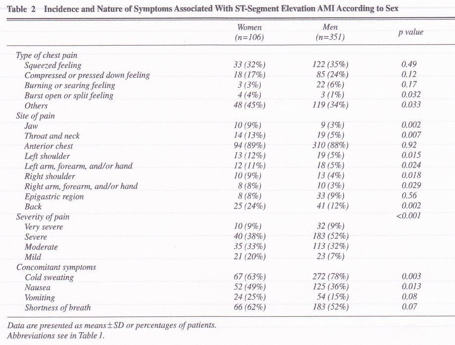 症状に関しては、急性心筋梗塞と診断された796例中148例の臨床症状の検討(adjusted odds ratio, 95% confidence intervals)では、右腕への放散痛(2.23, 1.24-4.00)、両腕への放散痛(2.69、1.36-5.36)、嘔吐(3.50、1.81-6.77)、前胸部中央の痛み(3.29、1.94-5.61)、冷や汗(5.18、3.02-8.86)が多く、教科書的に記載されている心筋梗塞に特徴的だと言われている安静時痛(0.67、0.41-1.10)、左腕への放散痛(1.36、0.89-2.09)よりも頻度が多かった。