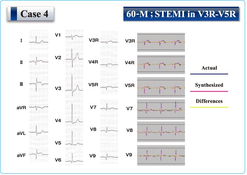 図のV3R、V4R、V5RでSTが上昇しているのが分かる。Actualは実際に電極を張った際の記録であるが、Synthesizedはコンピュータが通常の12誘導の心電図から計算して導き出したV3R-V5Rに相当する波形である。ほとんど差がないことが見て分かる。