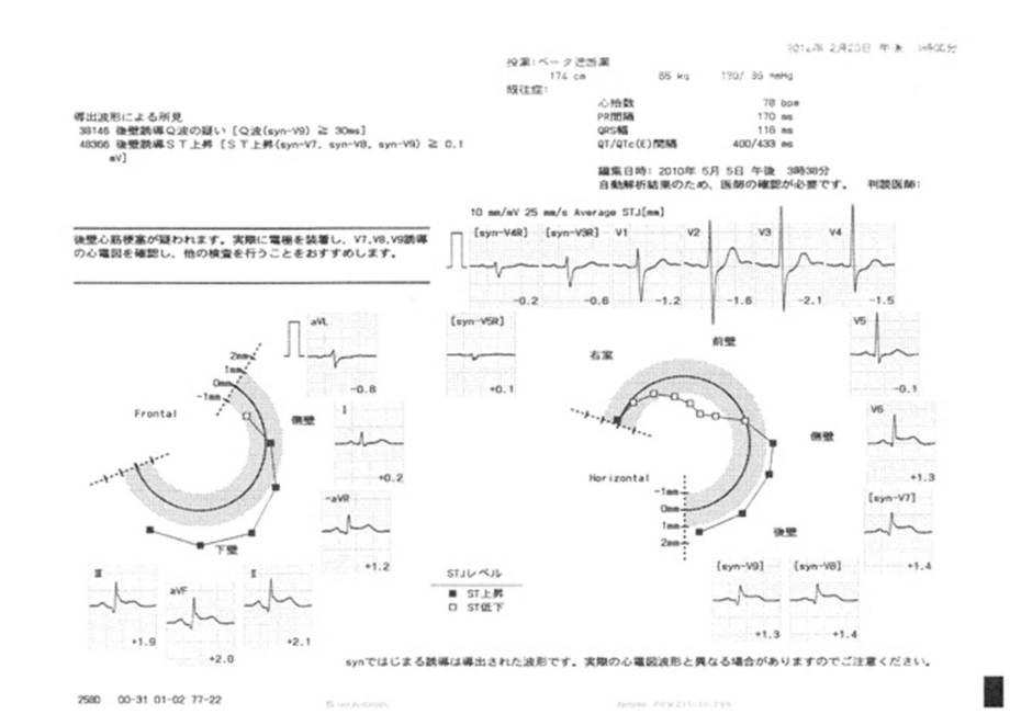 また、後壁の心筋梗塞においてはV7-9の誘導を取らないと、通常の12誘導からは判断できない。