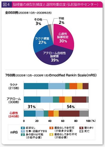 内容と補足「日本人の死亡原因の第三位が脳卒中で、70歳以上の人の平均入院日数は男性で85日、女性で125日である。その75%以上が脳梗塞であり、脳梗塞の27%が心源性脳塞栓症である。そのうちの半分以上がmodified Rankin Scaleで4-6の重症例である。