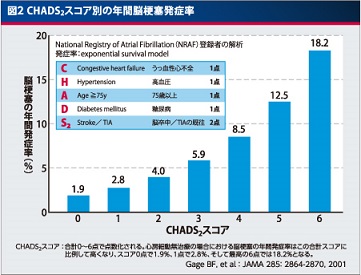 脳卒中治療ガイドラインに、非弁膜症性心房細動(NVAF)患者の脳卒中リスクの超過と抗血栓療法の選択基準としてCHADS2スコアが推奨されている。