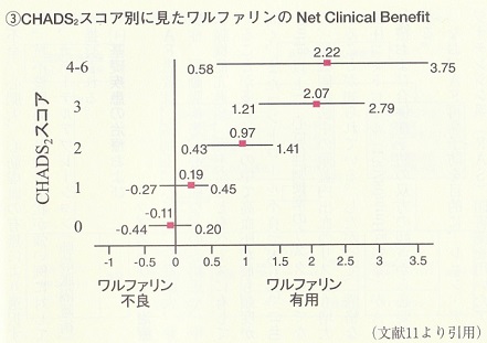 ワルファリン投与によるベネフィットはCHADS2スコアの点数により異なる。