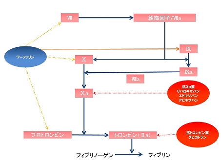 ワルファリンの効果は下記の図のように、凝固カスケードの数か所に作用している。止血に関与するⅦ因子に影響していることにより、いったん出血した際に止血が困難な状態となる。