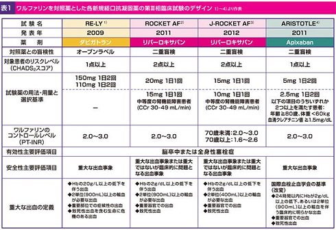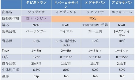 その上、ワルファリンには、モニタリングが必要なこと、治療域が狭いこと、細かい容量調節が必要なこと、投与量が人により大幅に異なること、効果が出てくるまでに時間がかかること、効果がなくなるのにも時間がかかること、併用薬の注意が必要なことなど、数々の問題点があり、新規抗凝固薬(NOAC)が開発発売されるにいたった。以下にそれぞれの薬剤の比較一覧表を示す。