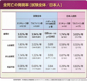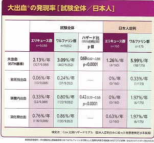 表にはないが、リバロキサバンの副作用としての消化管出血はワルファリン0.76%とに比較し0.86とやや増加傾向にある点は注意が必要である。
