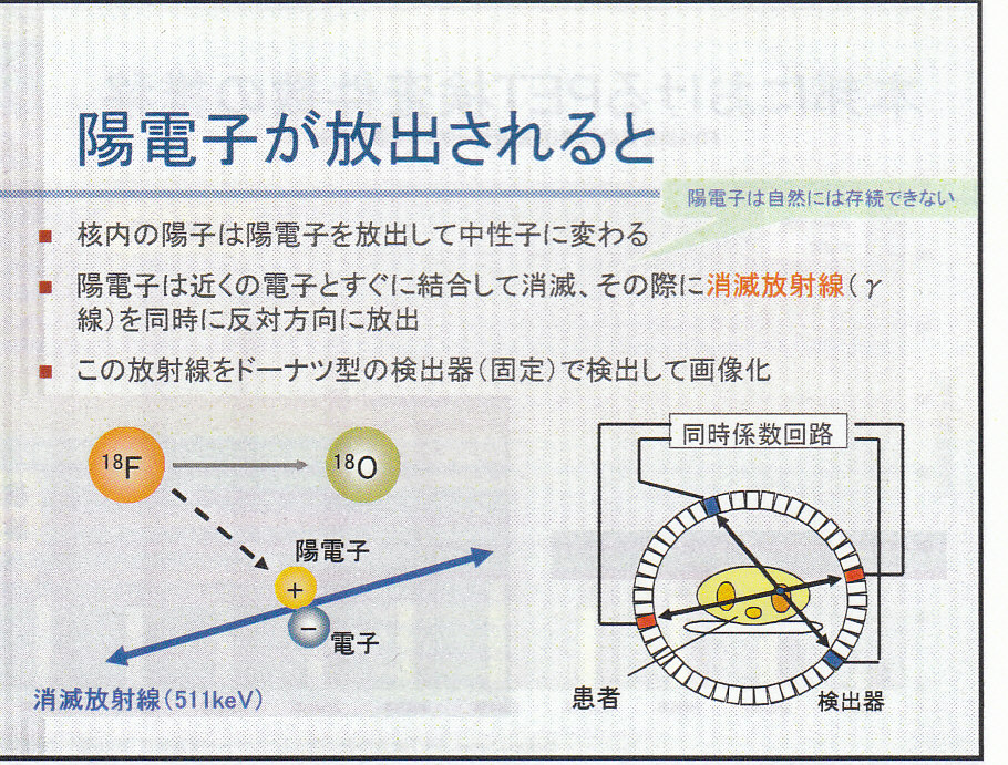 原理は、核内の陽子が中性子に変わる際に放出する陽電子と近くの電子が結合して消滅する際に反対方向に放出する消滅放射線をドーナッツ型の検出器で画像化するものである。