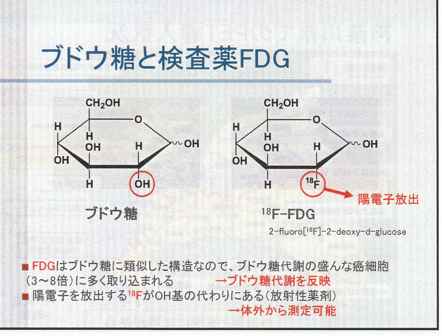 ① 血糖値が高いと、腫瘍への集積が低下したり、筋肉など周囲組織への集積が増加したり、コントラストが低下したりするため、検査前5時間は絶食、糖質を含んだ飲み物や輸液も禁止することが原則となる。直前にインスリンで血糖値だけを下げても組織内の糖濃度が低下しないので、血糖値が300㎎/dl以上の時には中止になることが多い。