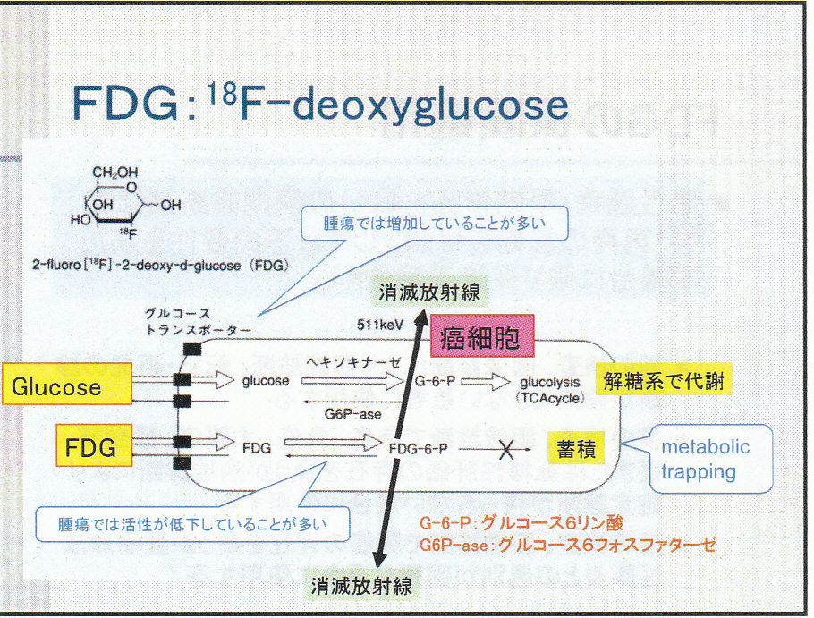 FDGはGlucoseと異なり解糖系に進まないので代謝されず癌細胞に蓄積されることになる。