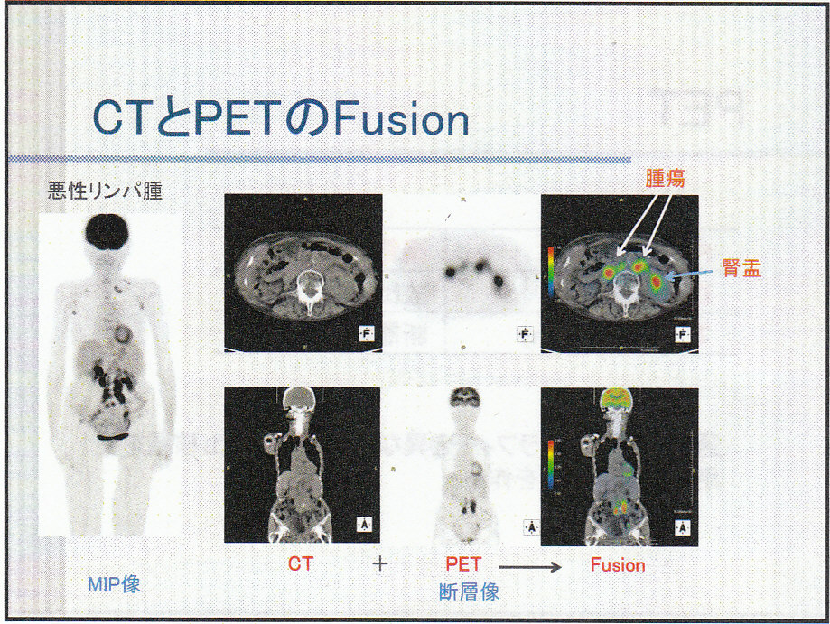 PETの画像の分解能はあまりよくないので、CT画像と融合させて検査がされるようになってきた。