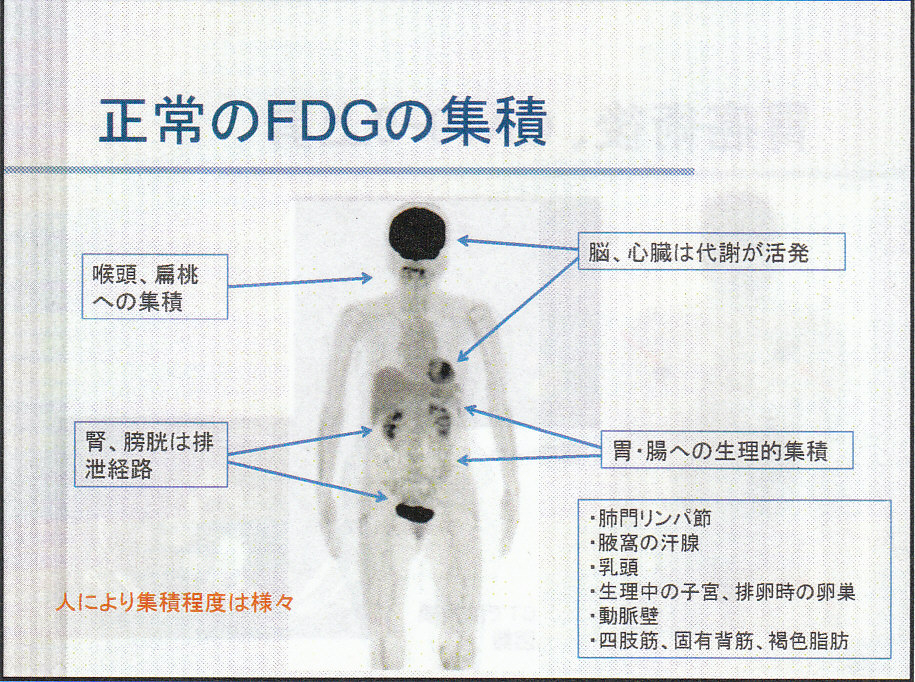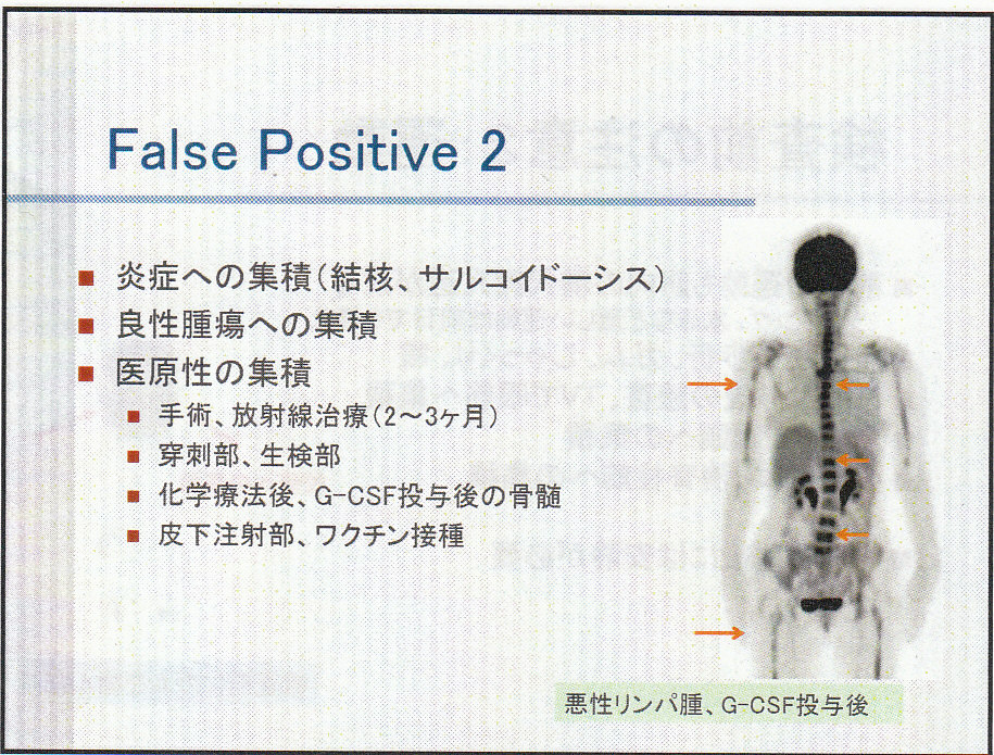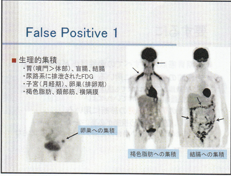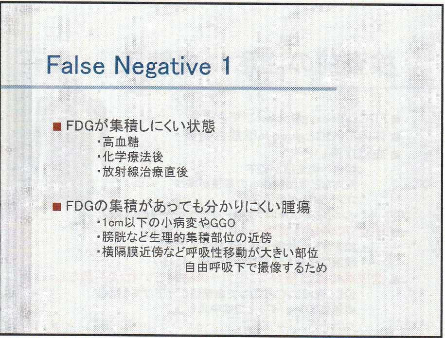 悪性腫瘍でも糖代謝が更新していない臓器(粘液、繊維成分が多い癌:胃癌、大腸癌の一部)や、Glucose 6 phosphataseが豊富にある組織では、取り込まれたFDGの代謝が速い組織で(高分化肝細胞癌)は集積像が得られない。