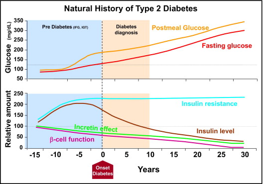 内容及び補足「糖尿病という疾患は、発病する10年以上前から膵β細胞機能が低下し、発病の数年前からインスリンの過剰分泌においても対応しきれず、食後血糖値の上昇がみられ、ついに空腹時血糖値も上昇して、発病となり、その後も徐々にインスリンの分泌脳が低下してくる進行性の疾患である。