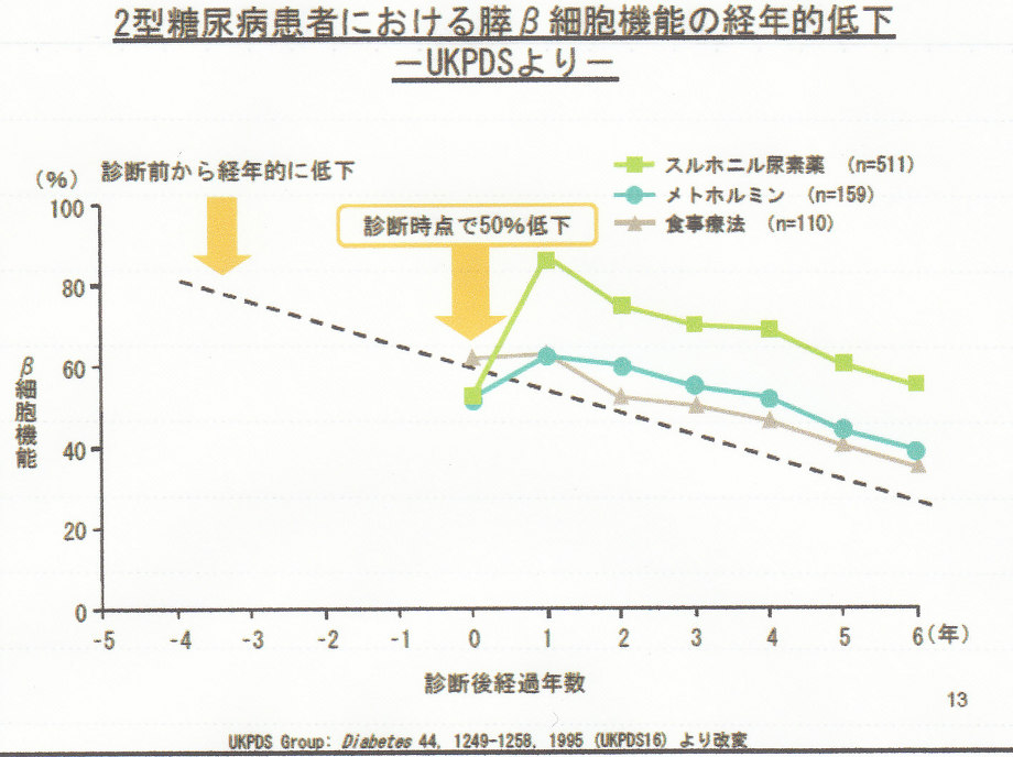 糖尿病発症時には膵臓のβ細胞機能は50%低下しており、食事療法、薬物療法を行っても、β細胞の機能は低下し続けていることが問題である。