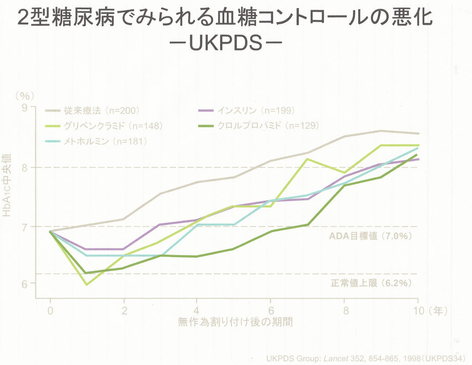 そればかりでなく、UKPDSで示されたことは、どのような治療を行っていても、全体としては糖代謝が徐々に悪化してくるが非常に問題である。