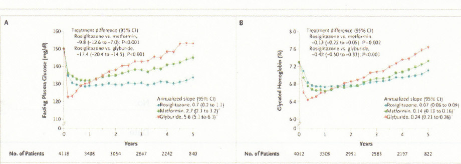 グリベンクラミド(オイグルコン、ダオニール:オレンジ色)、Rosiglitazon(日本未発売:青色)、メトホルミン(緑色)の単剤投与においては血糖値もHBA1cも徐々に増加してくる。