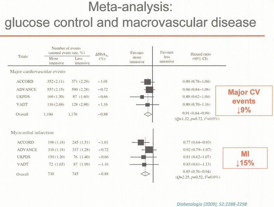 そうはいっても、血糖のコントロールにより大血管障害は9%低下し、心筋梗塞は15%減少させることができる。