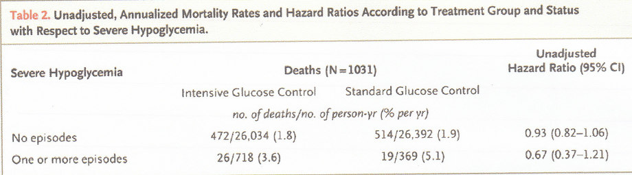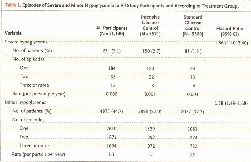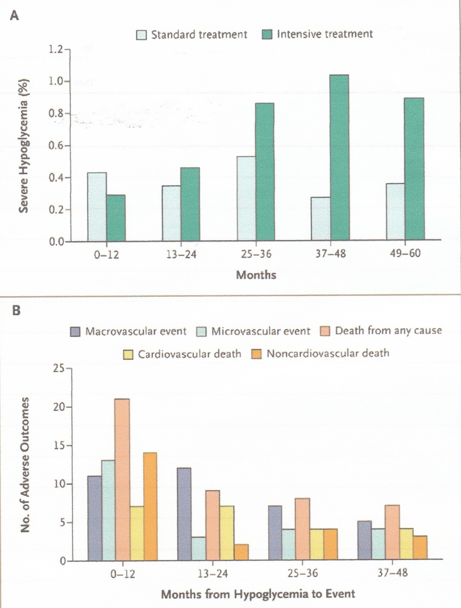 重症低血糖の発生頻度は治療開始当初においては差がないが、一年を過ぎるあたりから厳格な血糖コントロール群において顕著に増加してくる。