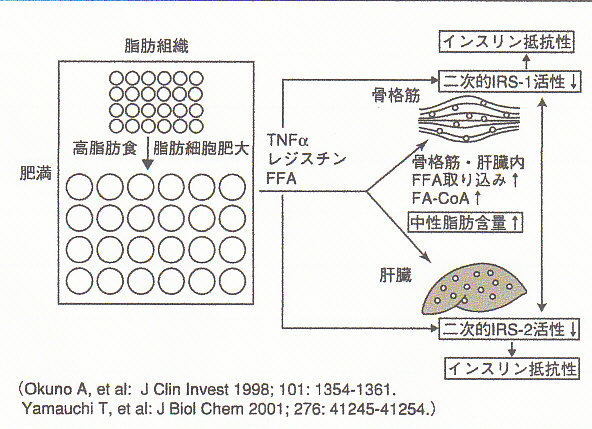このうちTNFα、レジスチン、FFAは骨格筋や肝臓でインスリンの情報伝達を障害し、院スチン抵抗性を惹起する。