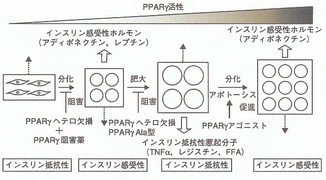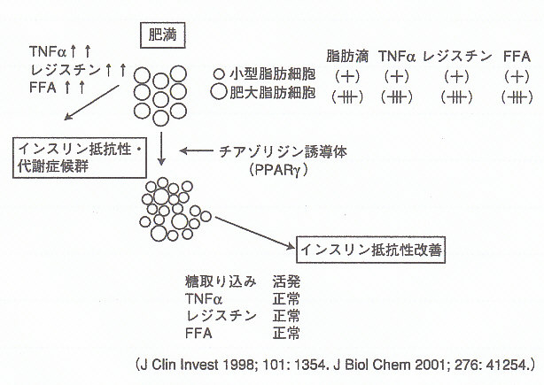 一方肥大した脂肪細胞からはインスリン抵抗性惹起分子の過剰分泌が生じ、その結果肥大した脂肪細胞はインスリン抵抗性を惹起する。この状態に、チアゾリジン誘導体を投与すると脂肪細胞の分化、小型化が促進され、再びインスリン感受性ホルモンとインスリン抵抗性惹起分子のバランスが逆転すると考えられる。問題は、この方法では肥満を抑制することができないことである。