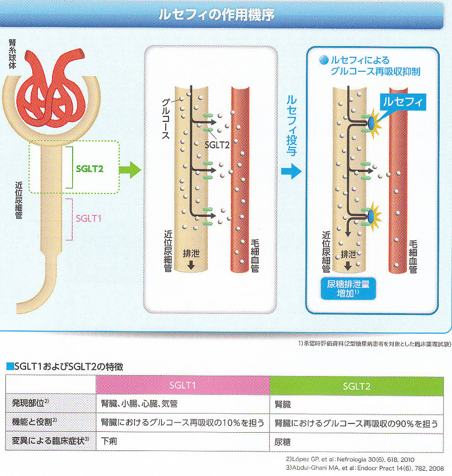 新薬であるSGLT2阻害薬の効果は近位尿細管でSGLT2により再吸収していた糖をブロックすることにより、糖を体外に排泄して血糖値を低下させるものである。SGLT阻害薬作成当初においては、SGLT2はそのほとんどが腎臓に分布しているが、SGLT1は腎臓以外にも小腸や心臓、気管にも存在するため、小腸への作用により下痢の副作用が高頻度に見られていた。腎臓に特異的に発現しているSGLT2阻害薬を作製することにより、副作用の下痢が著減した。