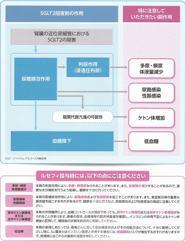 尿糖排泄を増加させるため、多尿・頻尿・体液量の減少がきたされる可能性があり、夏場においては適度な水分補給が必要となる。