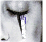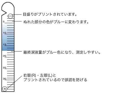 涙の分泌量の検査(シルマーテスト):先端を5mm折り曲げた専用の濾紙を下まぶたに挟まるように5分間かけ、涙でぬれた長さを測定。5mm以下の場合シルマーテスト陽性と判定。