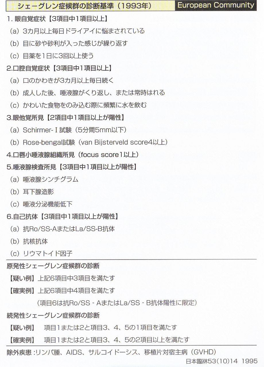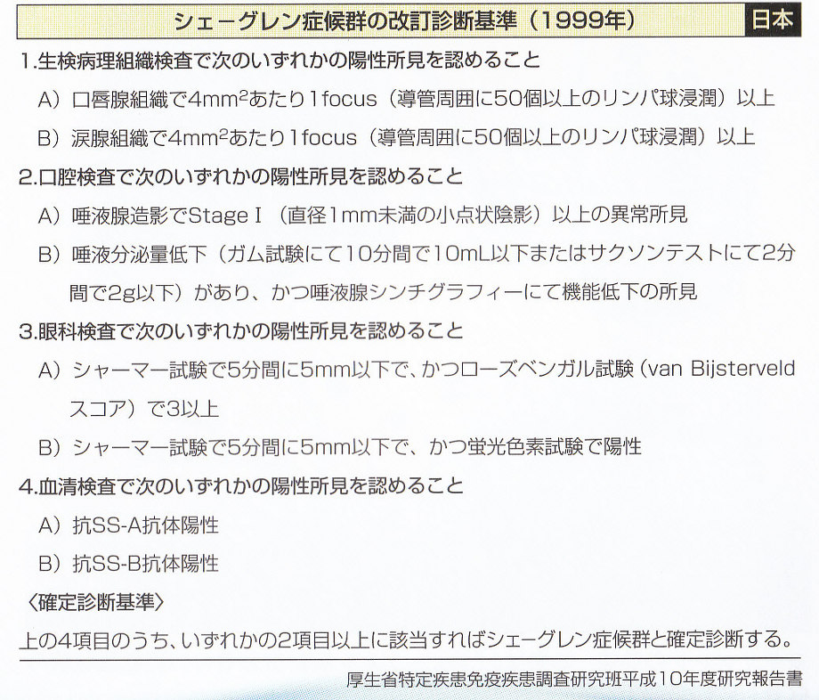 ヨーロッパの診断基準によれば、自覚症状も診断基準の項目に張っていおり、シルマーテストや血液検査と合わせて確定診断可能であり、こちらの診断基準を用いる方がより実臨床にあっている。