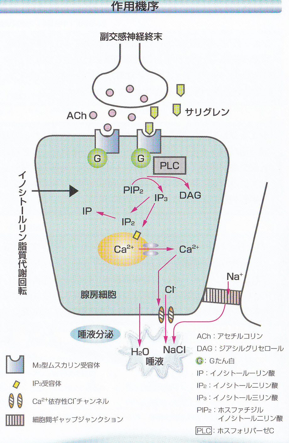 サリグレンの作用機序としては、ヒト型ムスカリン受容体M3発現細胞において胃のしとーるリン脂質代謝回転を促進させ、唾液の分泌量を増加させる。