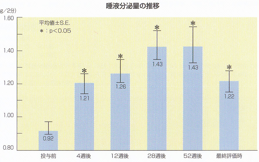 投与後1~3時間で唾液分泌量は最大になり、4時間以上にわたって持続する。シェーグレン症候群刊ジャンにおける血中半減期は5.1±1.6時間(30㎎単回投与)である。長期的にも唾液の分泌量は徐々に増加してくることが示されている。