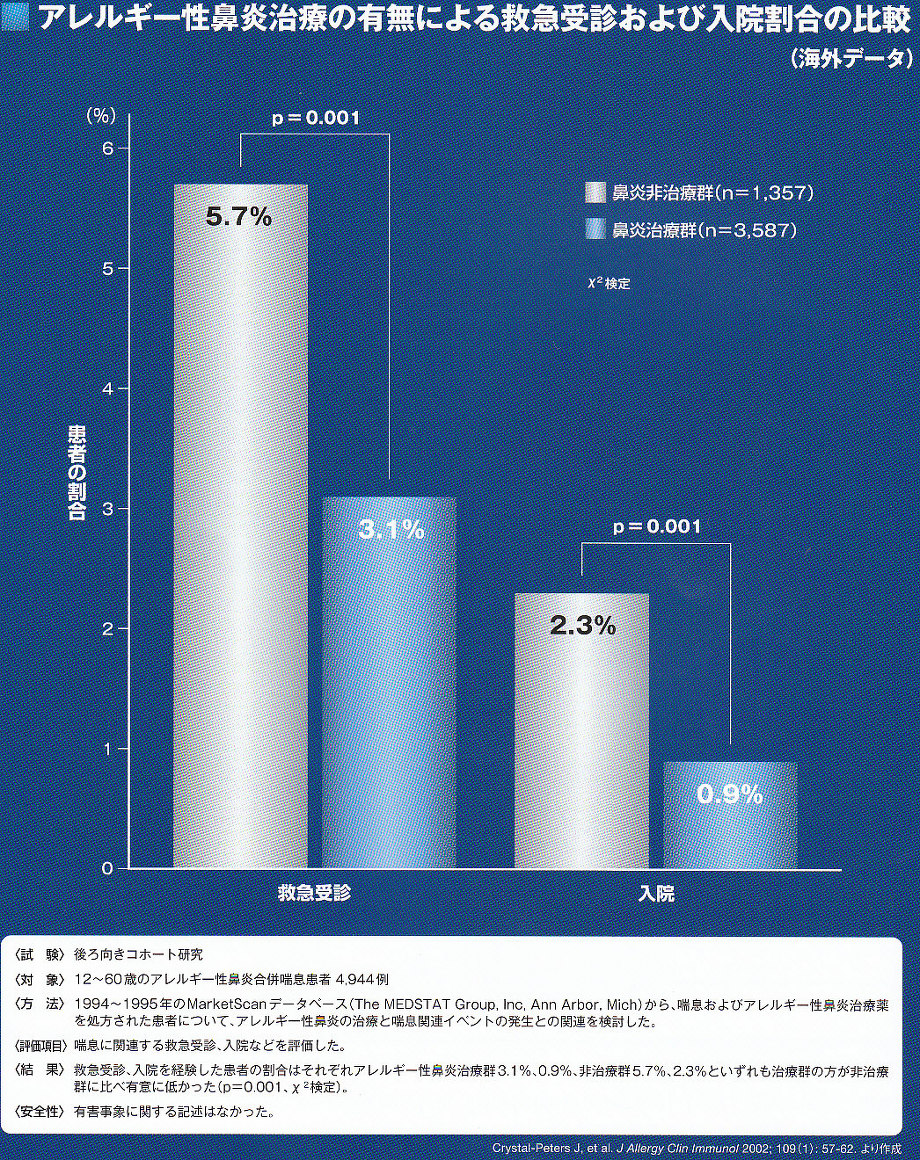 また、喘息患者において救急受診したり入院したりした患者の鼻炎の治療状況を見たコホート研究では、明らかに鼻炎治療をしてない人が多かった。