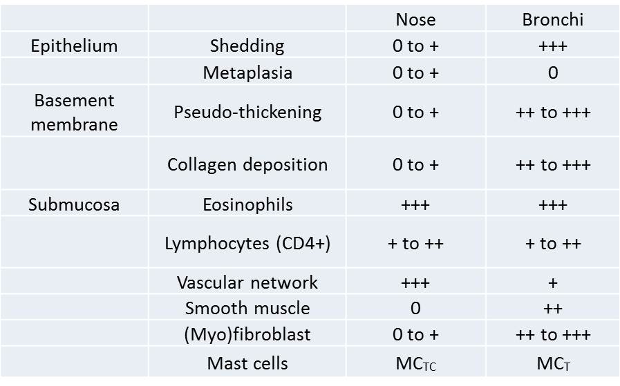 鼻炎と気管支喘息の病態に差異は認められるが、両者とも粘膜下の好酸球の浸潤やCD4+ リンパ球の浸潤が認められている。