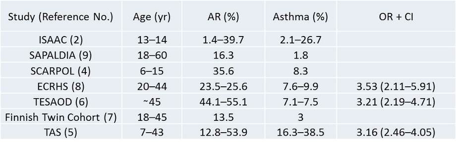 鼻炎患者とぜんそく患者の頻度について上記論文でまとめているものを見てみると鼻炎患者のほうが3~4倍ほど多い。