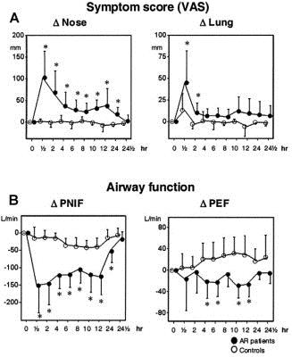 鼻粘膜にアレルゲンを投与した際の鼻と気道の変化を測定した結果を見ると、対照群に比べ、鼻炎患者においては、鼻汁の分泌の増加ばかりでなく、最大鼻急速流量 (peak nasal inspiratory flow: PNIF)、最大呼気流量(PEF)も有意に低下している。