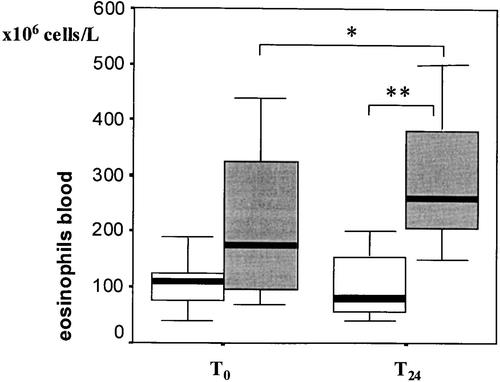 Number of peripheral blood eosinophils before (T0) and 24 h (T24) after segmental bronchial provocation. Grey boxes indicate allergic patients, open boxes indicate controls. Data are presented as median ± range. *p < 0.05, **p < 0.01.