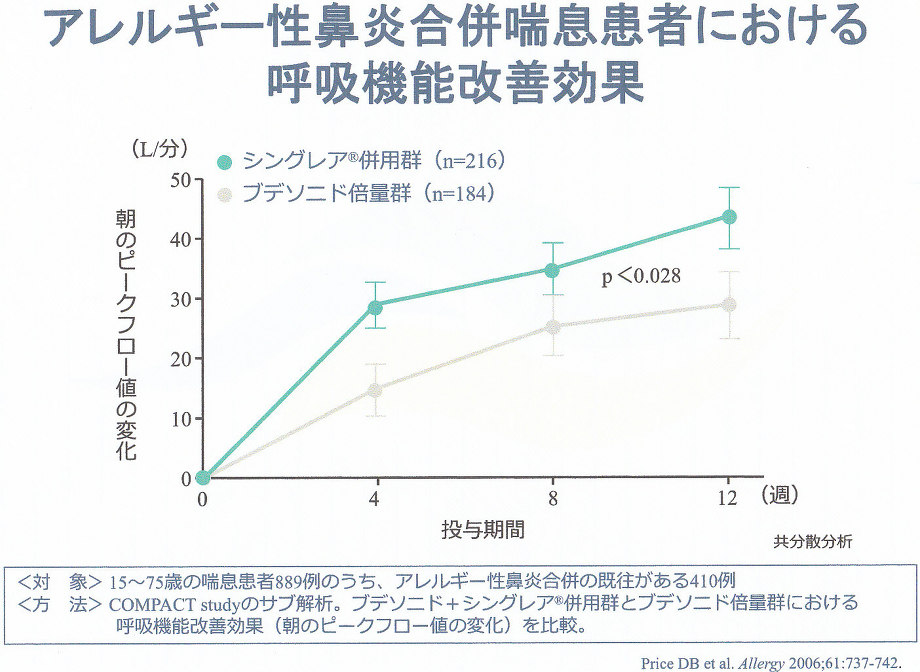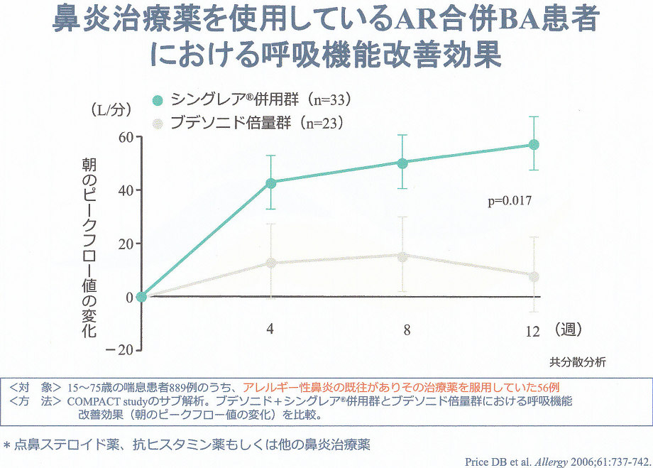 また、鼻炎治療を行っている鼻炎合併喘息患者にステロイドの倍量投与とシングレアの併用投与での比較でも、有意にシングレア投与例で呼吸機能改善効果が大きかった。