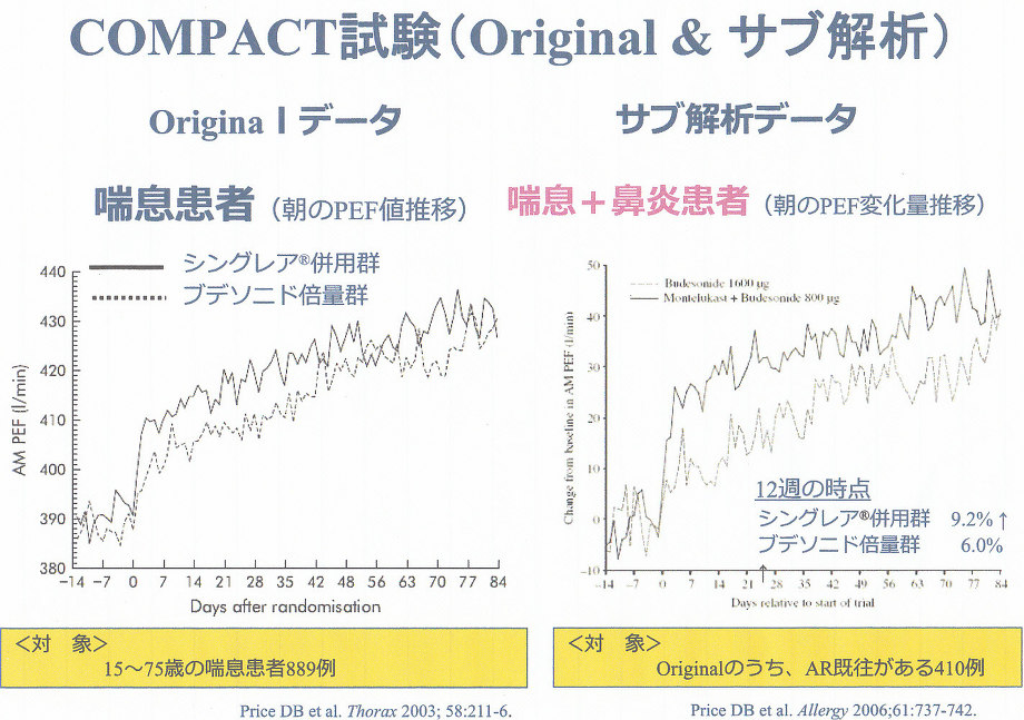 COMPACT研究において鼻炎合併喘息患者に対してステロイドの倍量投与とシングレアの併用投与での比較試験が行われた。朝のピークフローで評価されているが、シングレア併用群の方が呼吸機能改善効果が大きかった。
