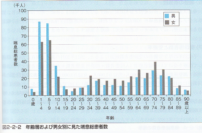 年齢別男女別喘息患者数:若年者に多く15歳ごろに一時軽快・寛解すし、患者数は減少するが、30代から増えてくる。