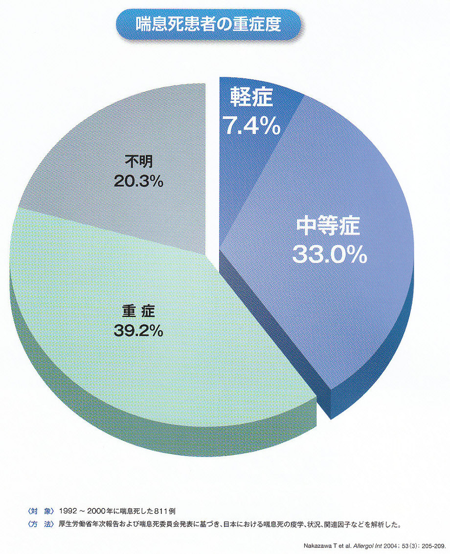 喘息死患者の重症を見ると、重症例が一番多いのは理解しやすいが、中等症例や軽症例でも死亡されている症例があり、発作が軽いからと日常の治療を軽視するのではなく、きちんとした治療が必要である。