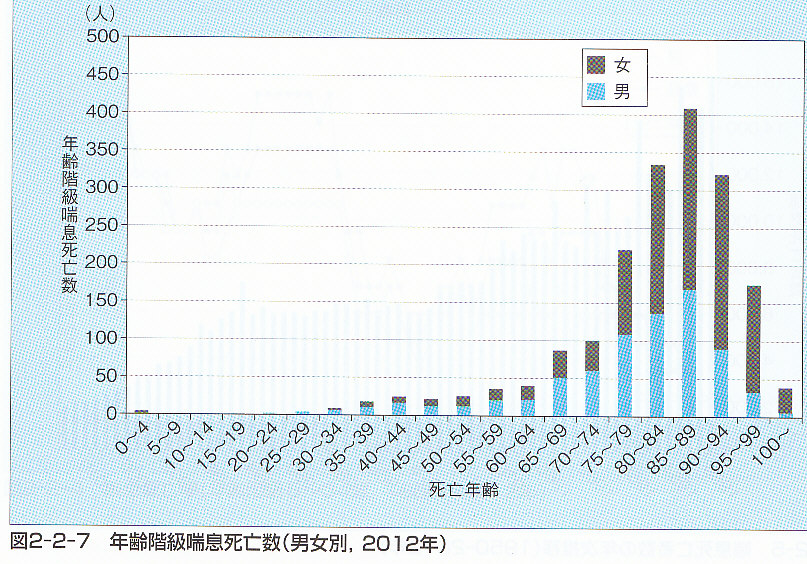 男女別年齢層別喘息死患者数:7個売れになればなるほど喘息死の患者が増加してくる。