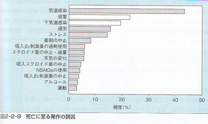 喘息死亡に至る発作の誘因を見てみると、気道感染・感冒・下気道感染が圧倒的に多いが、過労・ストレスといった精神的な状況も無視できない。薬剤の中止による悪化もあり、症状がよくなったからやめるという自己判断は慎んでもらうことも重要であるが、β刺激薬の過剰使用やNSAIDの使用での悪化について、繰り返し注意喚起していくことも重要である。