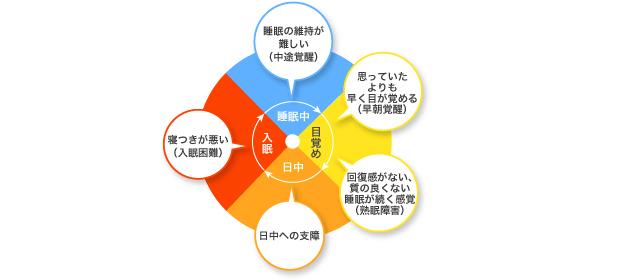 不眠症(入眠困難、睡眠の維持障害:中途覚醒や早朝覚醒)をもち、睡眠の量や質に関する不満足間の訴え