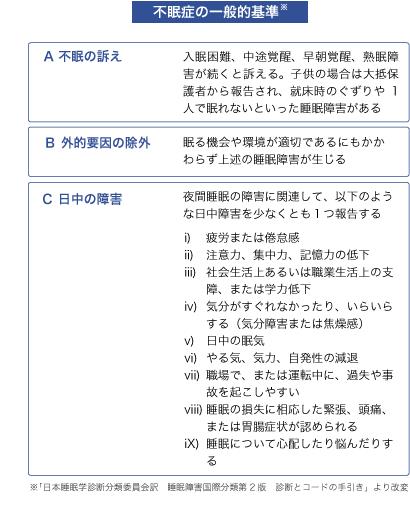 睡眠障害国際分類第2版(ICSD-2)による不眠症の一般的基準を下に示す。
